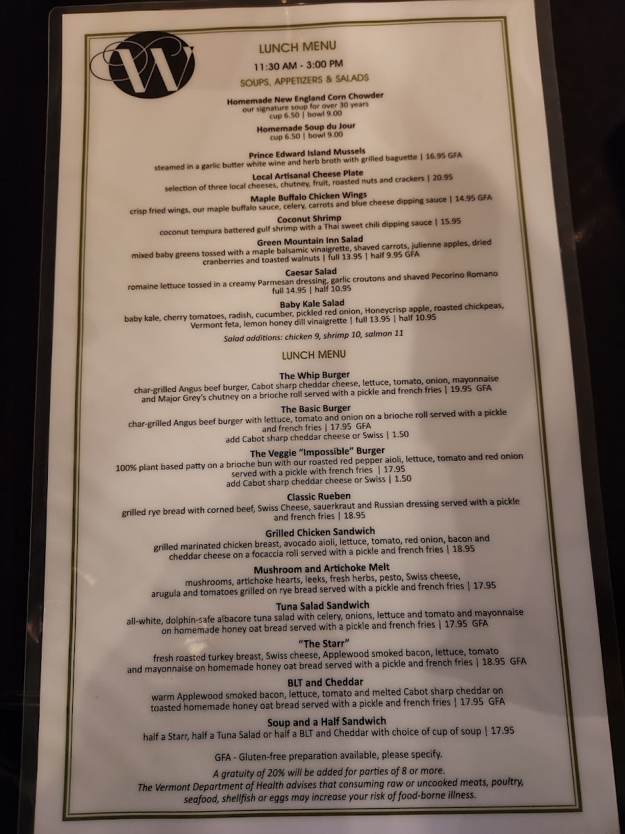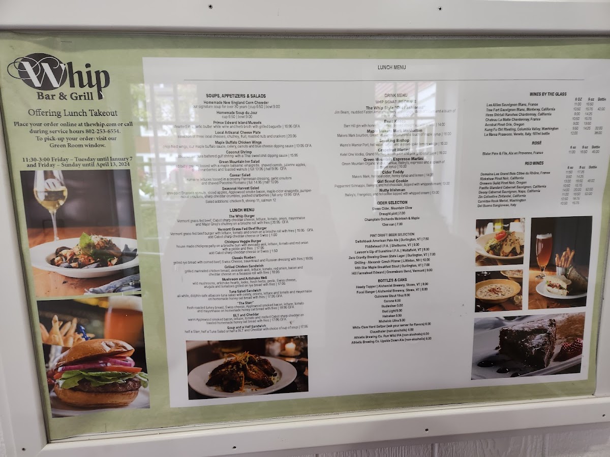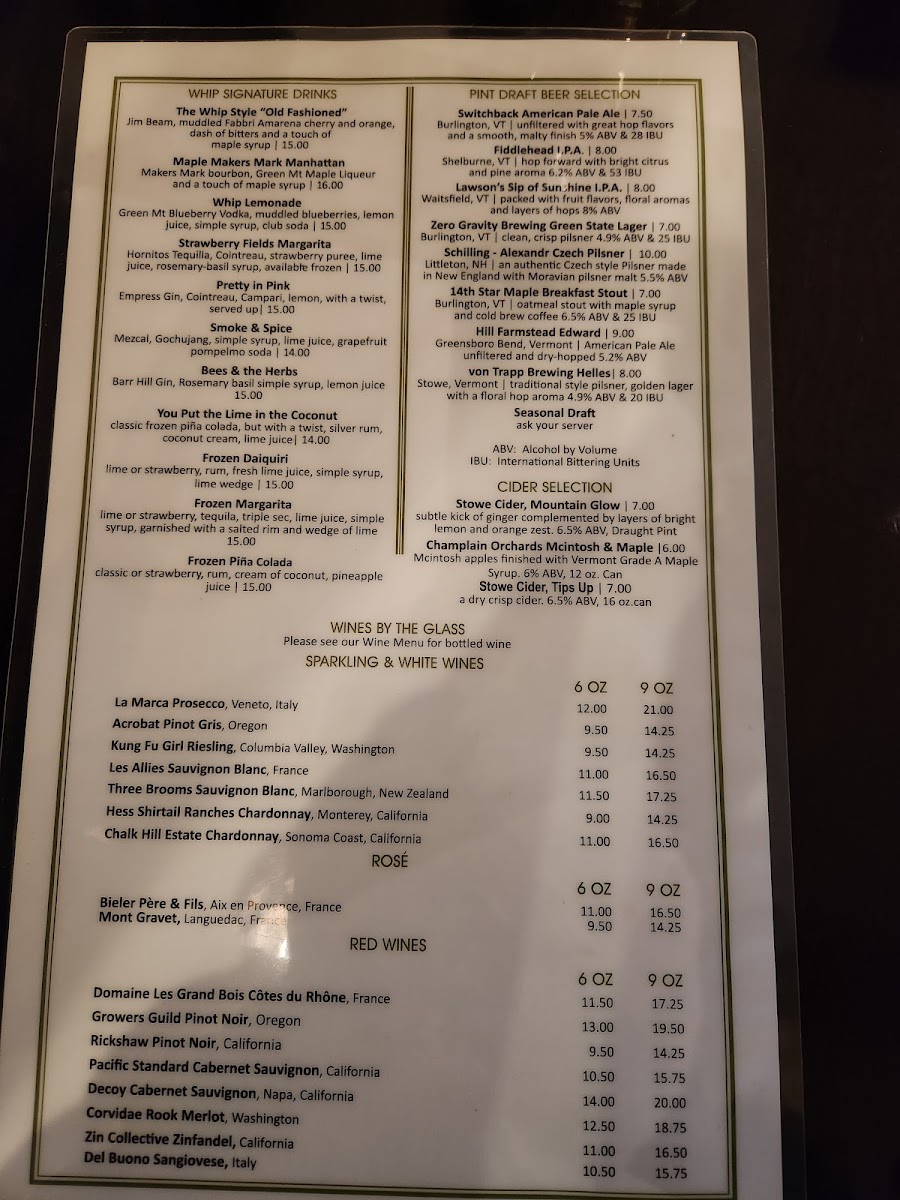 The menu at Whip Bar & Grill offers a balanced blend of comforting American classics and thoughtfully crafted bar fare, set in a relaxed yet refined atmosphere. It’s the kind of place where seasonal favorites like the Green Mountain Inn Classic Turkey Dinner and Steak Au Poivre sit alongside casual bites such as the Maple Buffalo Chicken Wings and Coconut Shrimp, making it easy to find something for any time of day or mood.