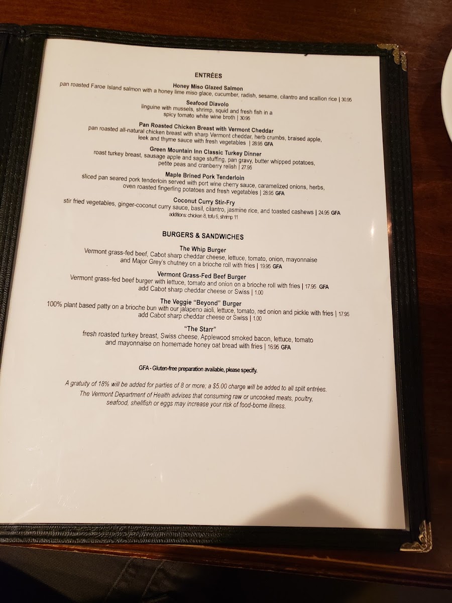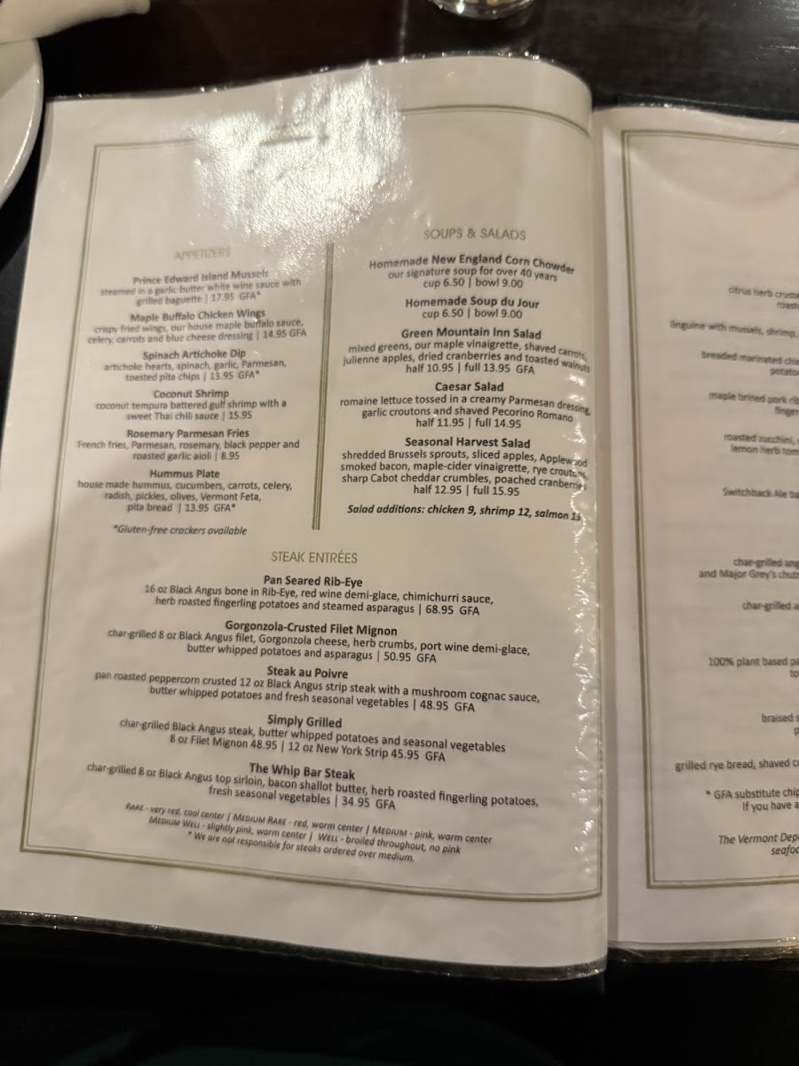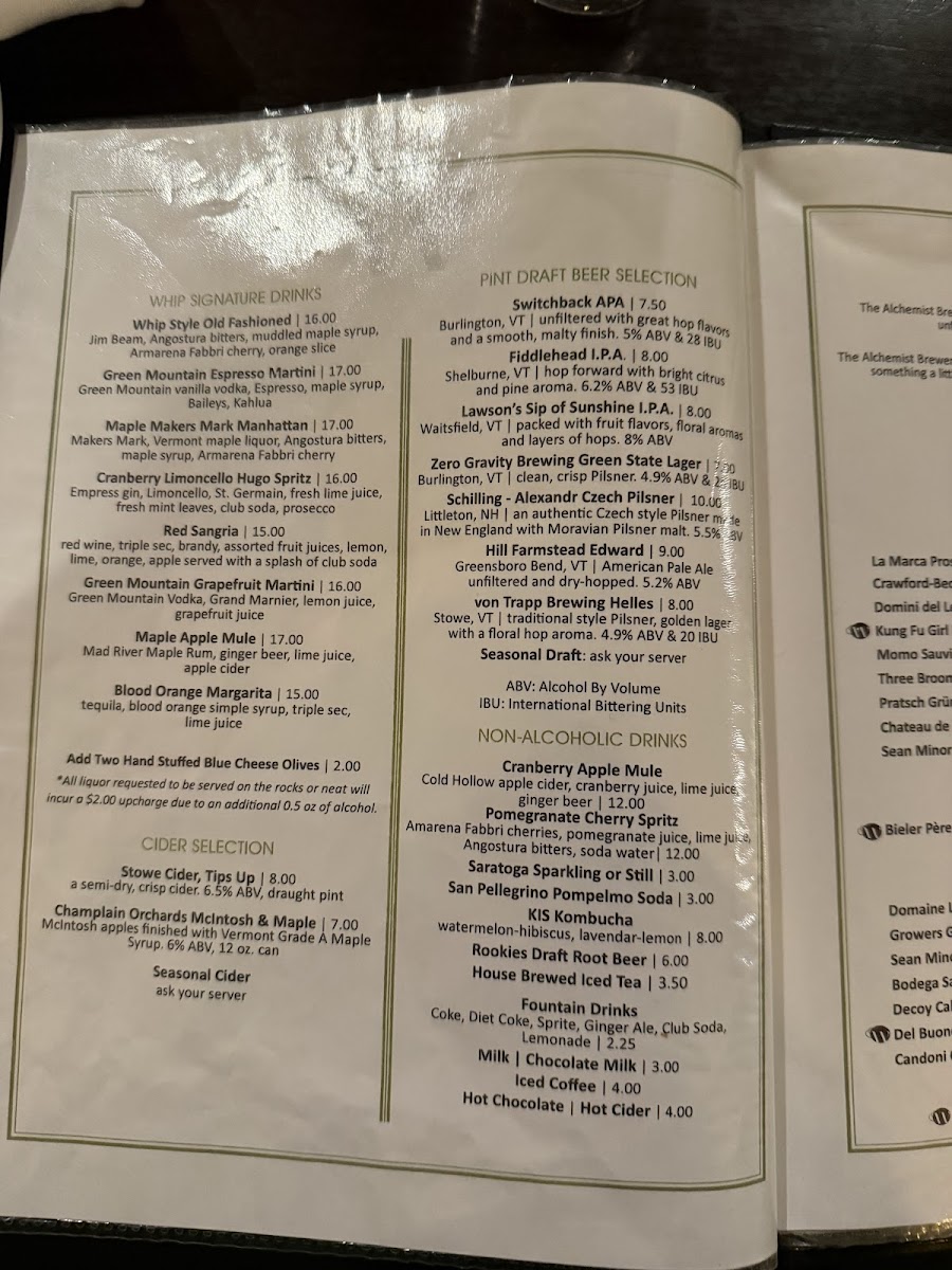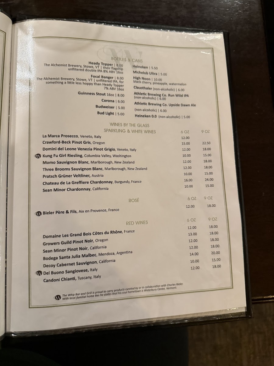 The menu at Whip Bar & Grill offers a balanced blend of comforting American classics and thoughtfully crafted bar fare, set in a relaxed yet refined atmosphere. It’s the kind of place where seasonal favorites like the Green Mountain Inn Classic Turkey Dinner and Steak Au Poivre sit alongside casual bites such as the Maple Buffalo Chicken Wings and Coconut Shrimp, making it easy to find something for any time of day or mood.